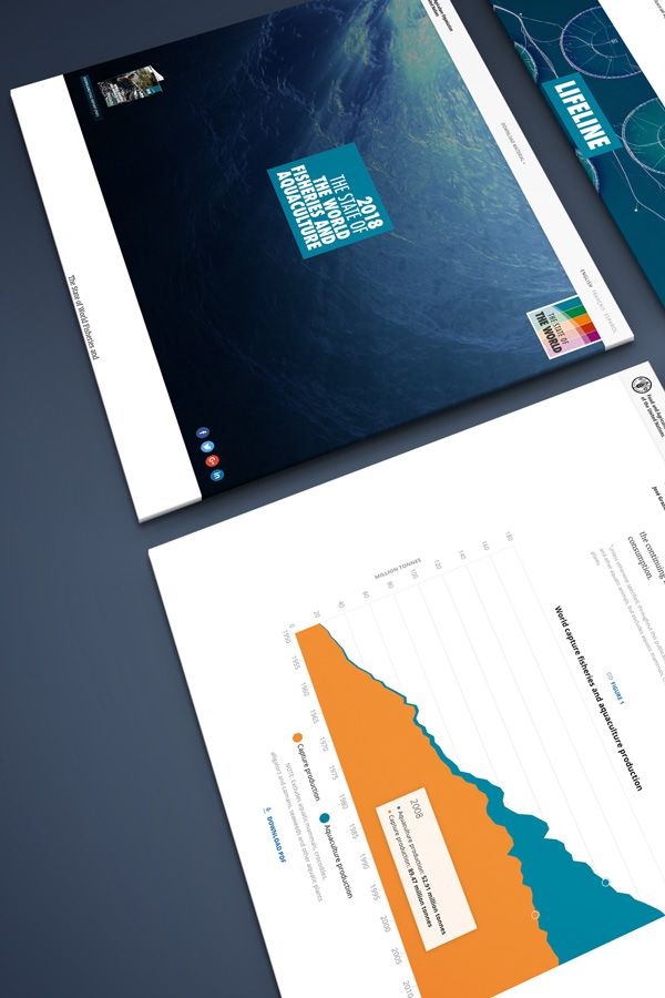 Abbiamo avuto il piacere di occuparci, attraverso la collaborazione con i vari reparti della FAO, dello sviluppo del “digital report” versione ridotta del “full report” pubblicato per fornire dati fondamentali e una visione obiettiva e globale delle attività di pesca e acquacoltura.